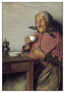 Gaetano Bellei (1857-1922) produced many images celebrating the relationships which grandmothers had with their younger family members, and the fun to be had with old friends, enjoying the time old age offers for recreation. ‘Grandmother and granddaughter’, ‘A Good Brew’ and other of his paintings are warm and engaging.